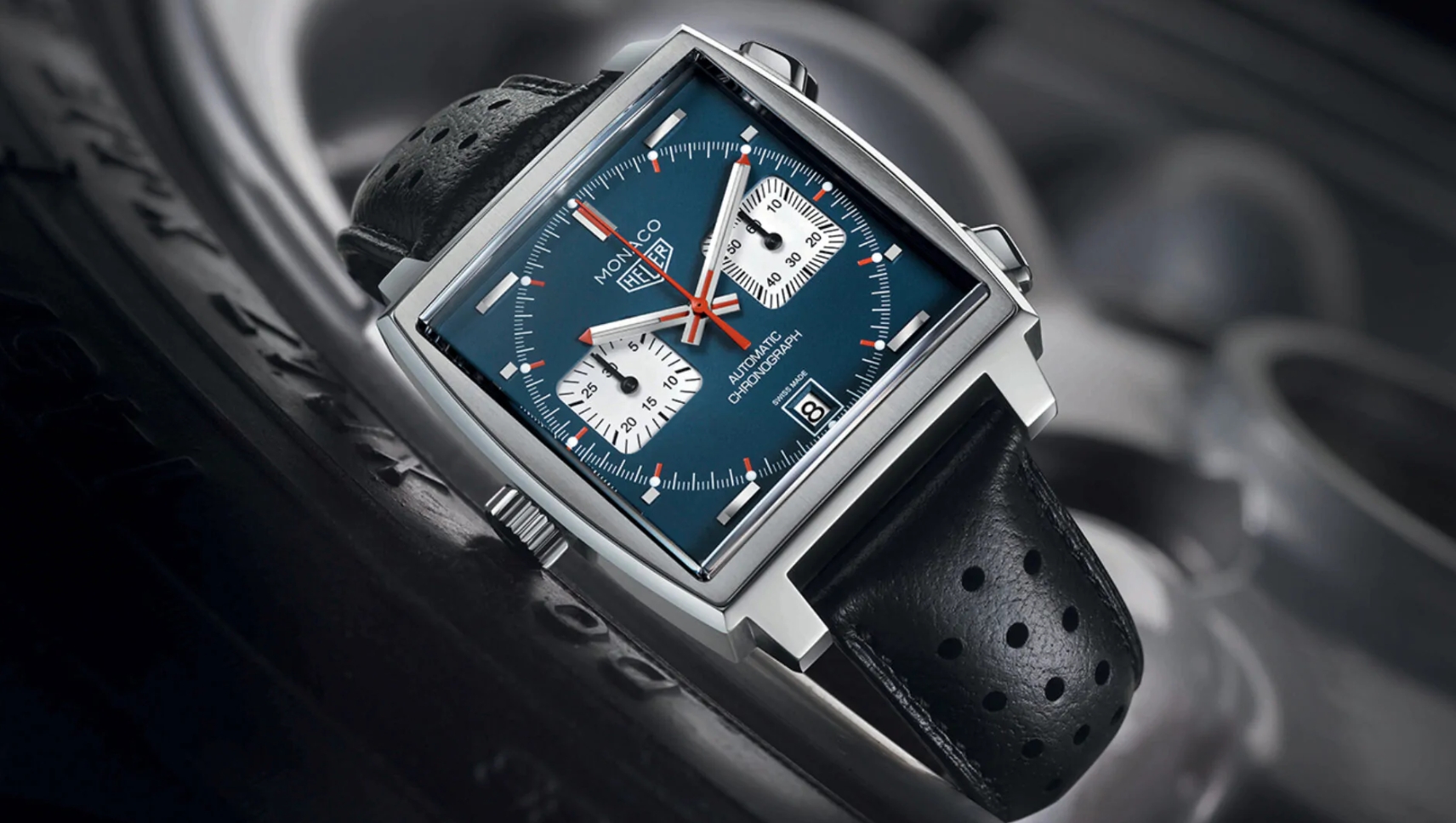 이름은 ‘모나코 그랑프리’에서 유래했으며, 대담한 사각 케이스, 메탈릭 블루 다이얼, 레드 핸즈, 왼쪽 크라운(수동 와인딩 불필요를 상징)이 특징입니다.